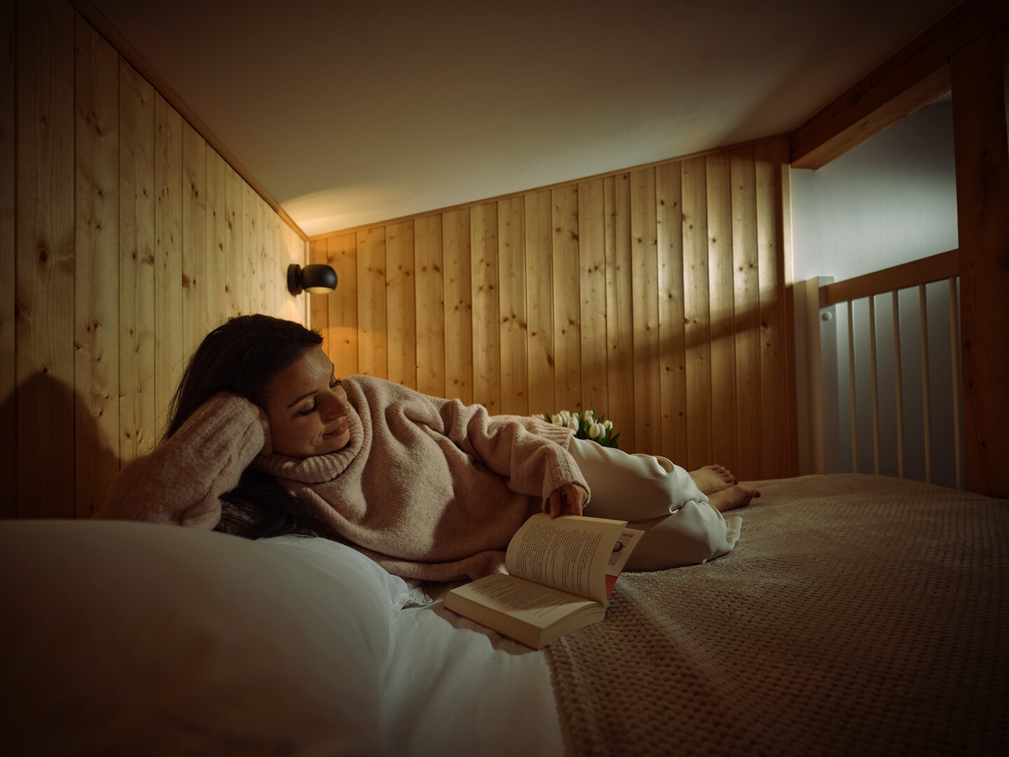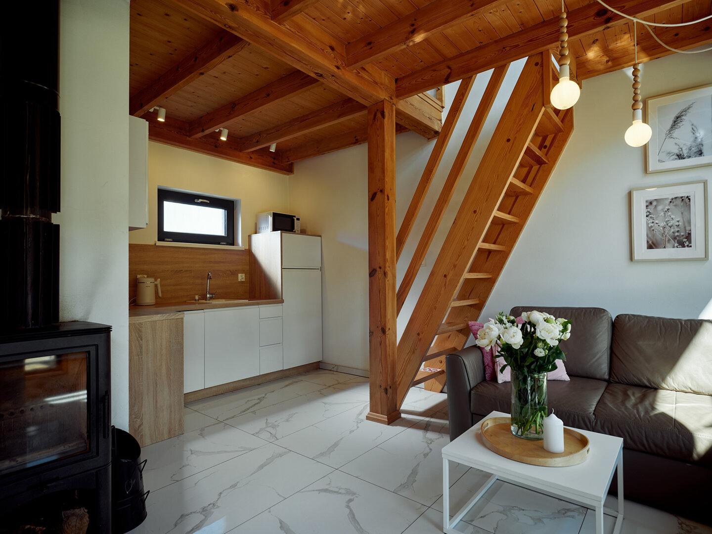 • Living room with kitchenette: Equipped with air conditioning, a fold-out dining table, spacious wardrobe, and a sofa bed. The perfect place to relax by the fireplace.